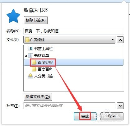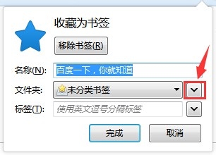 6、接下來(lái)我們將網(wǎng)頁(yè)添加到分類書(shū)簽中,打開(kāi)網(wǎng)頁(yè),點(diǎn)擊瀏覽器的【收藏】按鈕,選擇書(shū)簽分類后點(diǎn)擊【完成】,如圖所示: