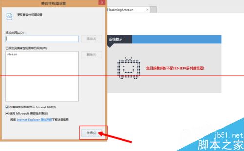 4、在“添加此網站”后,直接點擊“添加”,把該網站添加到兼容性視圖中,點擊“關閉”