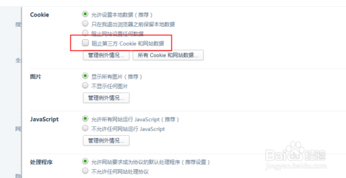6、Cookie設置中找到并去掉“阻止第三方 Cookie 和網站數據”前面的對勾