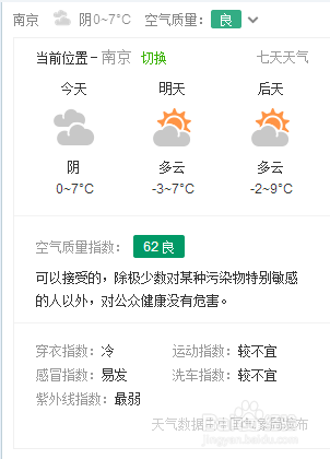 2、將鼠標移至360好搜界面左上角城市天氣區域,該區域將顯示該城市天氣的詳細情況,如圖所示: