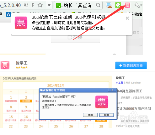 第二步:點擊圖標后,根據提示安裝“搶票王”,在瀏覽器的有上角出現圖2提示和一個“票”圖標,安裝完成