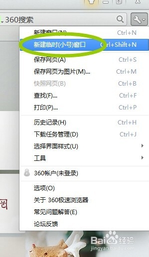 3、然后選擇【新建臨時(小號)窗口】選項,打開窗口頁面。看下圖所標示選項