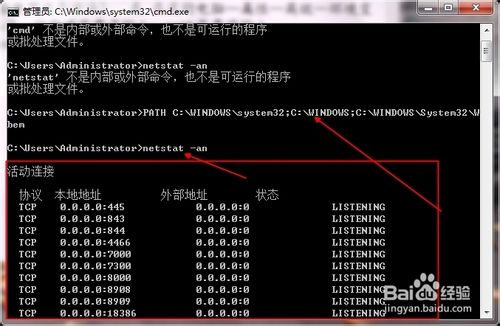 4、再輸入netstat -an進行檢測一下是否導入了路徑,出現圖片中所示字樣說明導入成功,但是這樣只能用這一次,需要永久使用的話必須到我的電腦—屬性—高級—環境變量 里面重新設置路徑,按新建變量名輸入:path變量值輸入:%SystemRoot%/system32;%SystemRoot%;%SystemRoot%/System32/Wbem