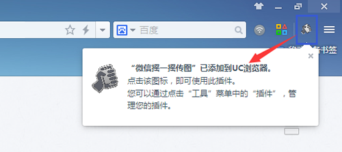 4、添加成功后,在uc瀏覽器的右上角,就能看到“微信搖一搖傳圖”的圖標(biāo)了。