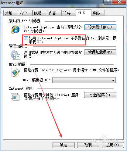 5、將“如果Internet Explorer不是默認的Web瀏覽器,提示我”前面的勾子去掉,然后點擊確定,如下圖所示。