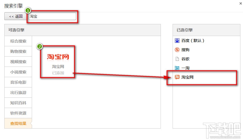 4:輸入你想添加的,比如淘寶??蛇x引擎就有選擇,點(diǎn)擊圖標(biāo)的右下角有個(gè)加號(hào),就可以看到已選引擎里面就有了。