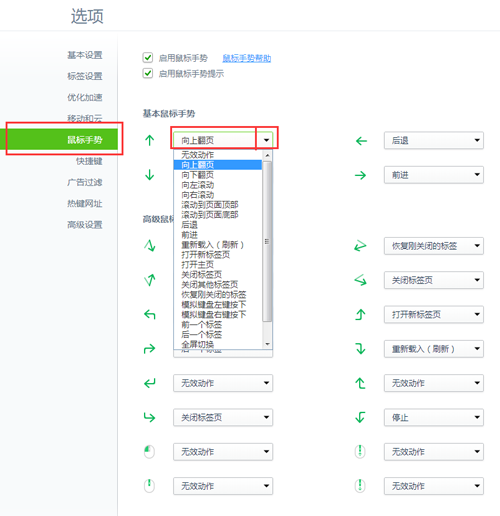 3、然后選擇“鼠標手勢”。在右邊點擊三角形按鈕,可對鼠標手勢進行設置,設置自己喜歡的手勢。