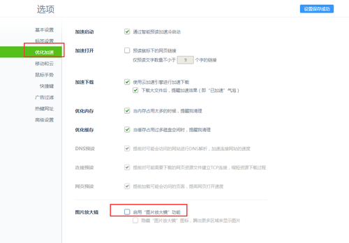 3、然后選擇“優(yōu)化加速”。最后一項(xiàng)的圖片放大鏡功能勾掉即可。