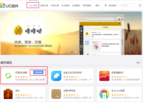 2、在彈出的方框,選擇【熱門推薦】---【頁面自動刷新】點擊【立即安裝】