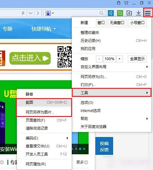 另外,大家還可以在百度瀏覽器菜單中的,工具中找到“截圖”功能,如下圖所示: