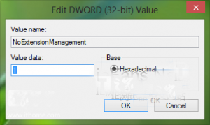 3、接著在上圖窗口中的右側(cè),找到NoExtensionManagement(REG_DWORD)(值應(yīng)該為1)雙擊,打開如下窗口;