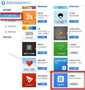 第二步:點(diǎn)擊瀏覽器最右上角《小鎖》,再次點(diǎn)擊《實(shí)用工具》即可選中對(duì)網(wǎng)頁(yè)進(jìn)行英文翻譯的翻譯應(yīng)用。然后點(diǎn)擊安裝