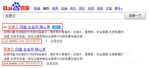 在搜索結果中可以看到第一個標記官網的百度云的域名是yun,第二個百度云的域名是pan,百度云的前身是百度網盤,這個概念延續下來,網盤已經局限了百度云的發展,所以百度推出百度云的全新產品,并整合了之前的百度云盤。