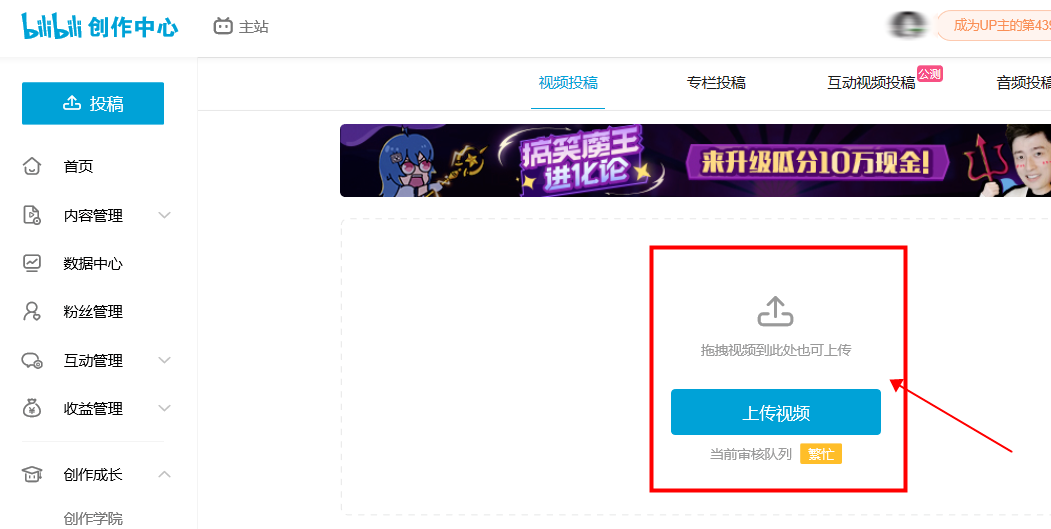 2、點擊【上傳視頻】選擇需要上傳的視頻,或者將需要上傳的視頻直接拖拽到紅色方框區域。