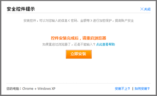 為使控件安裝順利完成,需要注意以下兩點(diǎn):1、安裝前請關(guān)閉掉正在運(yùn)行的其他程序,如阿里旺旺、貿(mào)易通、卡巴斯基殺毒軟件、360保險(xiǎn)箱、安鐵諾殺毒軟件等。2、安裝成功后,關(guān)閉瀏覽器然后重新打開瀏覽器后再登錄支付寶。注:若密碼框出現(xiàn)紅色叉叉,不能安裝安全控件,建議您更換Firefox瀏覽器或Chrome瀏覽器再進(jìn)行操作。