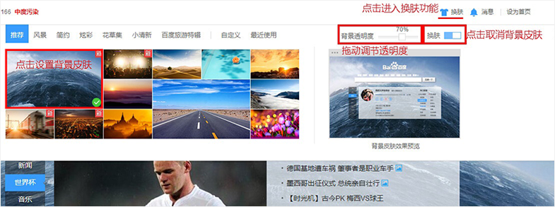 看膩白花花的背景?有一大波美麗皮膚正在逼近!點擊換膚,各種背景隨你挑!還能調節透明度,讓你的首頁隨
