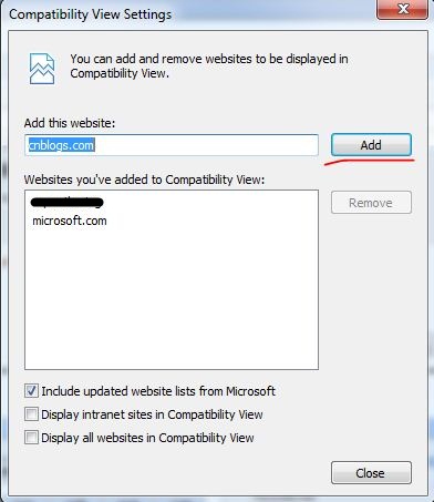 2. 在菜單欄中選擇Tools->Compatibility View Settings,在打開的窗口中將當前站點添加到兼容性視圖的列表中。