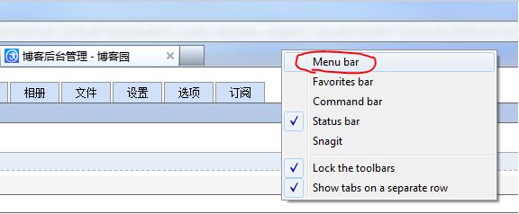 1. 在IE9的工具欄上單擊右鍵,選擇Menu bar,顯示菜單欄。