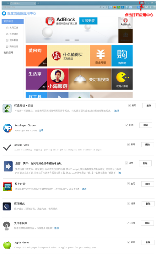 點擊右上角的圖標進入應用中心→分別點擊安裝按鈕并勾選啟用按鈕→在工具欄上點擊相應的圖標啟用插件。