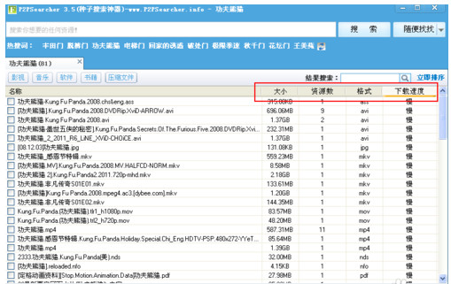 6、對(duì)于搜索出來(lái)的資源可以根據(jù)大小、資源數(shù)、格式、下載速度進(jìn)行排序: