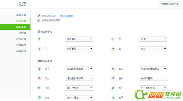 打開“選項設置”以后,選擇“鼠標手勢”。在鼠標手勢中,我們就可以看到不同鼠標手勢所實現的功能了,如:手勢向上代表向上翻頁、手勢向下代表向下翻頁。