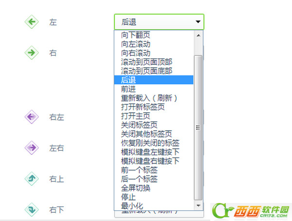 除了默認的功能外,用戶還可以點擊手勢設置實現效果,如:向左的鼠標手勢,用戶就可以自行設置手勢效果為向下翻頁、滾動等操作了。