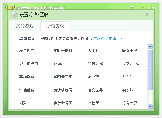 初次使用的用戶,可以在身份驗證成功以后,通過界面上“選擇游戲加速”按鈕打開游戲列表。已經使用過網易UU的用戶,可以通過主界面上的更換游戲/區分按鈕選擇新的游戲。