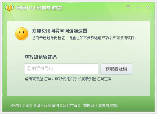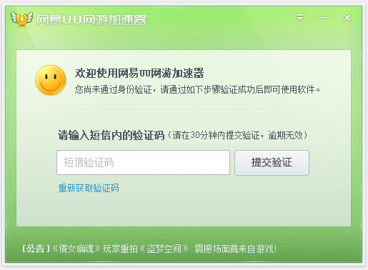 網易UU免注冊免登錄,只要您在首次使用時提交身份驗證,下次啟動即可直接進行加速。點擊歡迎界面中的開啟免費加速,將跳轉到身份驗證界面。