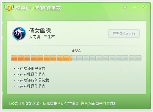 當您選定了游戲和區服以后,網易UU直接進入加速過程。已經使用過UU加速器的用戶,開啟軟件后會顯示前一次加速的游戲。