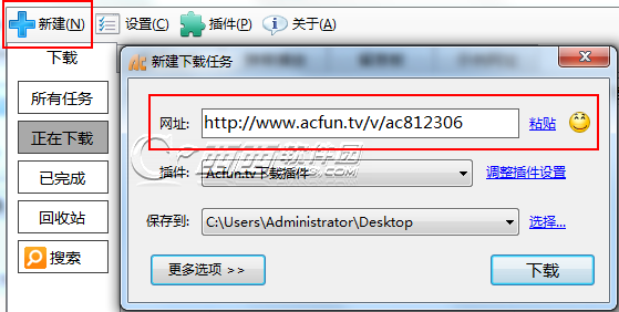 3、點擊ACfun動漫視頻下載器界面左上角的新建,將網址粘貼在此處。注意粘貼后面的表情為笑臉則地址正確,如果是流汗的表情就錯了。