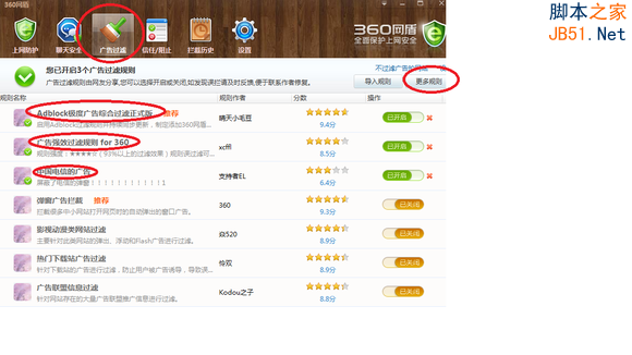 3.跳出360網(wǎng)盾,點更多規(guī)則,去下載圖上三條規(guī)則的最新版,另外記得定期上網(wǎng)看看這三條規(guī)則有沒有更新,有更新請盡量更新以保持最佳屏蔽效果(一定要配合360瀏覽器使用,我試過用搜狗,結(jié)果網(wǎng)盾基本沒用)【其中最重要的是第二條規(guī)則一定要用,其他規(guī)則不開問題也不大,不過不要盲目的規(guī)則全開,會拖慢瀏覽器速度的】