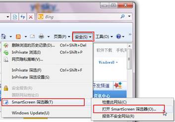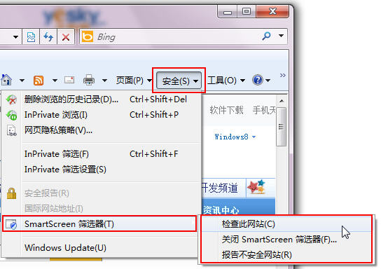 IE8以及更高版本瀏覽器中的SmartScreen 篩選器提供了手動檢查指定網站安全性的功能。使用方法很簡單,只需先在IE8瀏覽器中轉到希望檢查的網站,選擇菜單“安全”—“SmartScreen 篩選器”—“檢查此網站”。