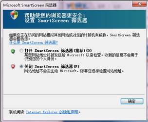 我們第一次開始使用IE8瀏覽器時,IE8會讓我們做一些簡單的選擇設置,其中就包括是否打開SmartScreen 篩選器(如下圖)。這里強烈推薦大家選擇打開SmartScreen 篩選器。