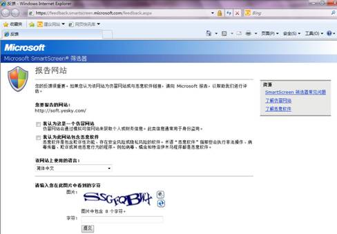 如果我們認為自己訪問的某個網站是危險網站,IE8瀏覽器的“SmartScreen篩選”提供了報告功能。我們可以選擇IE瀏覽器菜單“安全”—“SmartScreen 篩選器”—“報告不安全網站”。IE瀏覽器會跳轉到微軟的SmartScreen篩選網站,在這里按要求填入相關信息即可提交不安全網站的報告信息,經過相關驗證后,危險網站的數據資料會得到豐富。