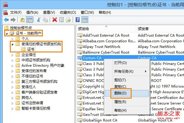 6、展開“證書”=》“受信任的根證書頒發機構”=》“證書” ,在右側列表中查找你需要刪除的證書,然后在將其刪除;