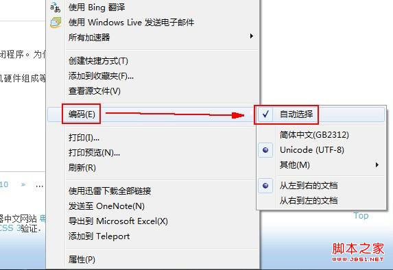 2. 在網頁上點擊鼠標右鍵,從彈出的列表中選擇 [編碼],再單擊 [自動選擇]。