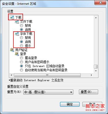 3. 在 [安全設定] 視窗中,滾動到 [下載] 區域,參考以下說明設置 [字體下載] 的方式,設置完全后單擊 [確定] 按鈕。