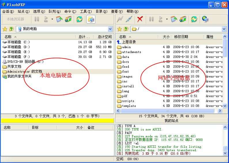 以上圖片,左側是你電腦上的文件、右邊是網站空間上的內容。如果你想把某文件夾上傳到空間上,只需在文件夾右鍵點擊,然后“發送”即可。