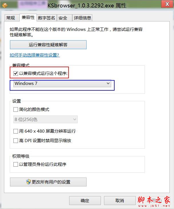 3.切換到"兼容性"標簽,然后把"兼容模式"下打勾,如圖中的紅色框,兼容性下拉框(圖中藍框)里選擇windowsXP或者windows7都可以,.然后點"確定".