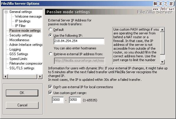 如果服務器是動態IP的,那么可以選擇下面的“Retrieve external IP address from”,利用FileZilla官方網站免費提供的IP查詢頁面獲取當時的公網合法IP,然后服務器把這個公網合法IP地址提交給客戶端。當然靜態IP也可以用這個,只不過沒有必要。