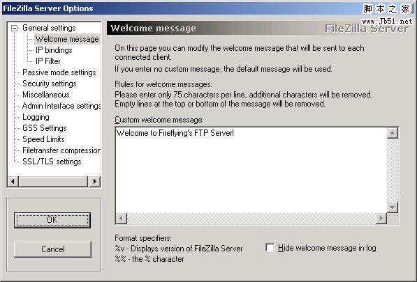 Welcome message頁面設置客戶端登錄成功以后顯示的Welcome信息。建議不要用軟件默認的,因為任何軟件都不能保證沒有什么漏洞,如果在這里暴露軟件名稱的話,一旦這個FTP Server軟件有什么安全漏洞,別有用心的人知道了服務器軟件的名稱就可能針對性地發起攻擊。所以建議這里設置的信息不要包含任何服務器資料。