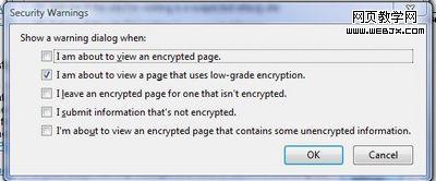 這一選項圍繞加密以及加密的網站,你可以選擇在訪問或離開一個加密頁面、提交未加密的信息等時侯,是否顯示警告,