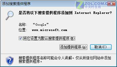 用戶只須在頁(yè)面上點(diǎn)擊紅色方框內(nèi)的Goolge按鈕,IE 7將會(huì)彈出一個(gè)添加對(duì)話框,然后勾選“將它設(shè)置為默認(rèn)搜索提供程序”即可(如圖3)。