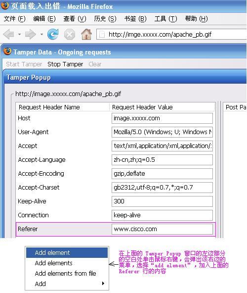 現在,我們想測試自己配置的圖片防盜鏈是否正常起作用。于是我們添加一個 Referer 頭部字段,并輸入 www.cisco.com ,如下圖所示,點擊“OK”提交后,發現我們的請求被重定向到 go_way.html 頁面,可見我們的配置是正確的。