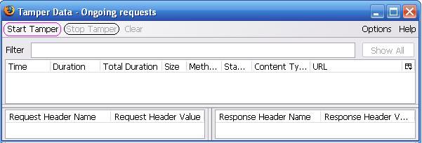 點擊 Firefox 菜單欄上“工具”菜單項里面的“Tamper Data”,就會彈出 Tamper Data 的主窗口,如下圖所示: