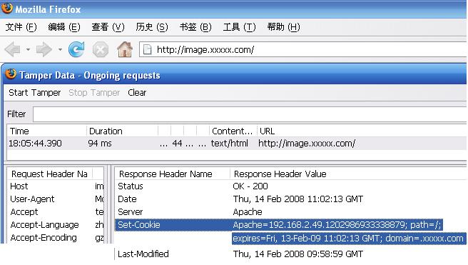 第一個例子:我們把 APACHE 配置為,當用戶第一次瀏覽我們的網站時,向用戶的瀏覽器寫入一個 Cookie,以方便對他們的訪問行為的跟蹤,然后,我們需要驗證配置是否正確。于是,我們開啟 Tamper Data,然后再訪問我們網站的某個頁面,接著分析 Tamper Data 所記錄的數據。可以從第 3 個窗口看到,我們的 APACHE 服務器確實向我們的瀏覽器寫入了預先配置的 Cookie,如下圖所示: