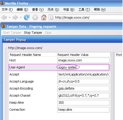 下面是測試我們配置的防惡意瀏覽器訪問。在下面的窗口,修改瀏覽器提交的 User-Agent 字段,將其設置為我們禁止的惡意訪問瀏覽器之一,比如 sogou spider,點擊“OK”提交后,發現我們的請求被禁止了,可見我們的配置是正確的。