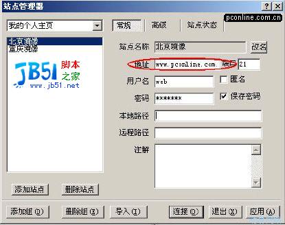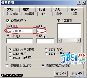 在"IP地址"中輸入所連接的服務器地址,FTP端口默認為21,不必進行修改。把"匿名"前復選框中的勾去掉,填入正確的用戶名及密碼。