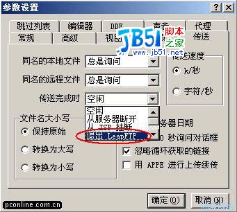 在該選項中的"同名本地文件"和"同名遠程文件"中,大家需設置好每次上傳時的一些響應,如遇到同文件名的時候,軟件是直覆蓋呢還是直接彈出一個對話框詢問你之后再做選擇。在"傳送完成后"可設置多種狀態,如"在空閑"、"從服務器斷開"的等。這可以根據臨時需要進行設置,如經常晚上上傳主頁的朋友來說,如果不想待太久的話,可以選擇"上傳完成后關機"。