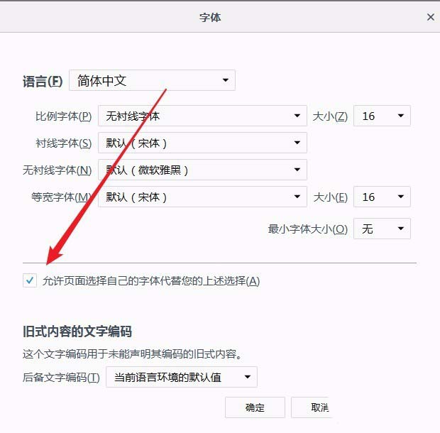 5、在打開的字體高級設置窗口中,找到“允許頁面選擇自己的字體代替您的上述選擇”設置項。